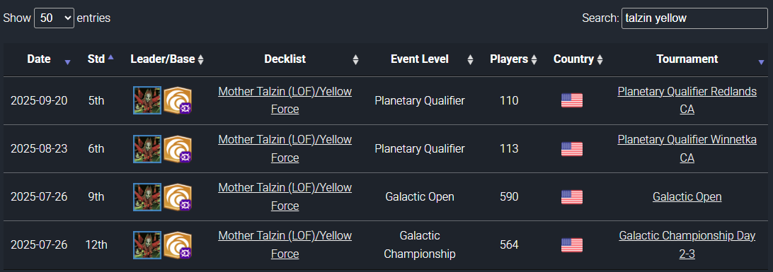 If you wanted to know what I am playing at Menifee, that’s still up in the air. If I’m lazy, I’ll probably run it back again with Talzin Yellow Force (now in a post-FT world for the first time). But I do think the games here showed it struggles pretty badly into the more control-ish decks, and it can just get blown out by ECL Vader. I’m usually not one to like a gameplan of “hope and pray they don’t draw a specific card on time”, so it might be back to the drawing board, as those types of decks (Blue Green Heroic or Villain) seem to be on the rise. But, that’s a problem for future me. As for the me of right now? I’m outta here. Peace.