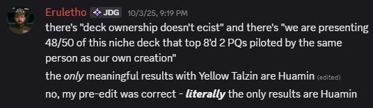 This also sparked a little bit of discussion on the SYC Discord server about the concept of “deck ownership” and if it exists or not. I do think the concept is very fuzzy, and relies heavily on public perception (or more specifically, an individual’s perception of public perception). Like, for example, I don’t even consider the Talzin Yellow list “mine”. In my head, it’s always been Beton’s list that I’ve appropriated for my own use, as I said previously. However, to probably the San Diego community (I hope I’m not conceited thinking like this), the Talzin Yellow Force list might be seen as “Huamin’s” because I’m the only person who has Top 8’ed with the deck and put up visible results.